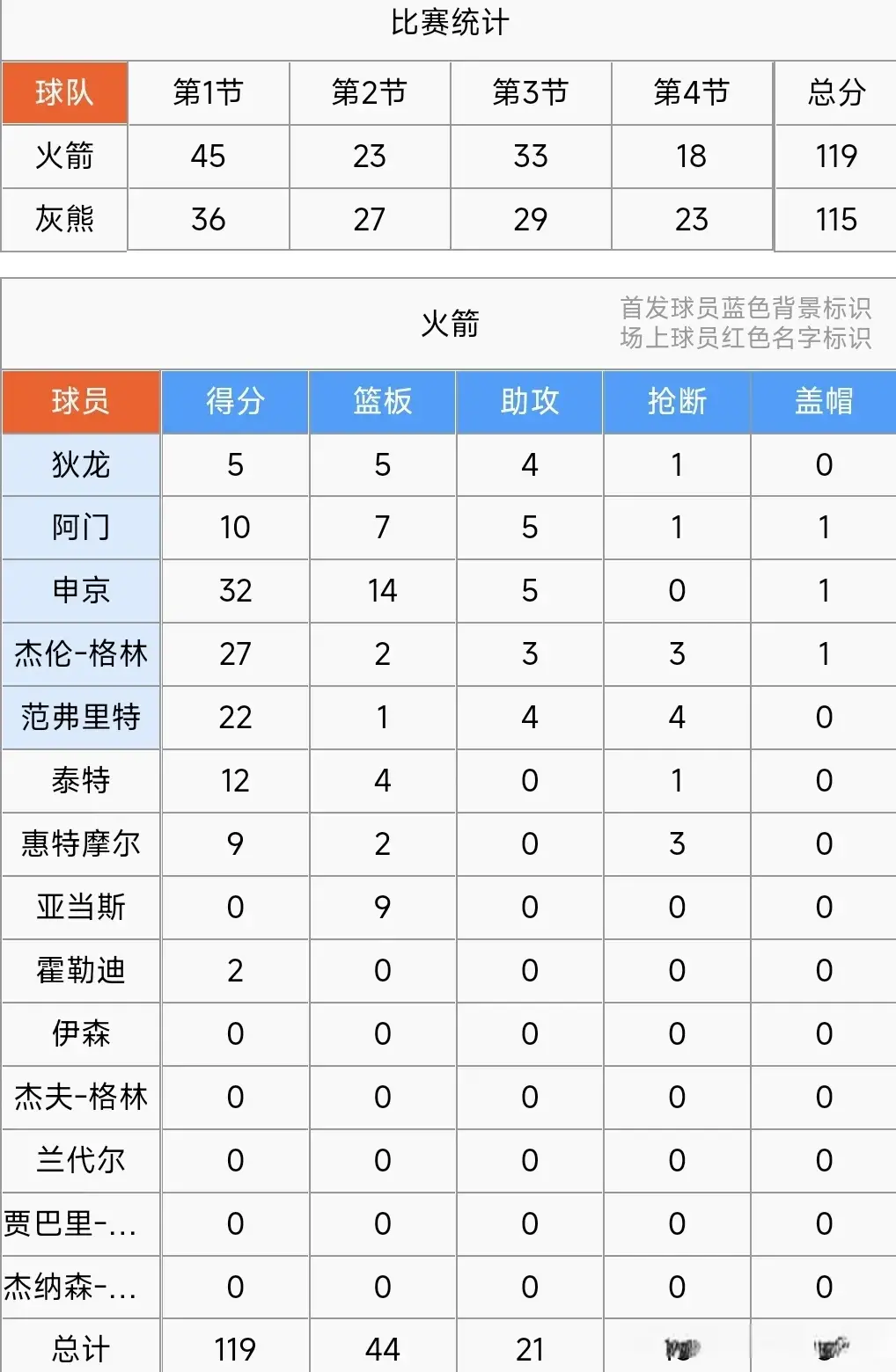 下半场易边再战,双方依然杀的热火朝天!火箭队杰伦.格林、范弗里特、申京三驾马车轮换轰炸得分,阿门、泰特也是偶尔锦上添花;灰熊队莫兰特、贾伦.杰克逊、贝恩、阿尔达马先后发力奋起直追。最终一番激烈厮杀比赛结束,火箭队119:115力擒灰熊喜获三连胜,赢得卡位战,继续稳居西部第2。