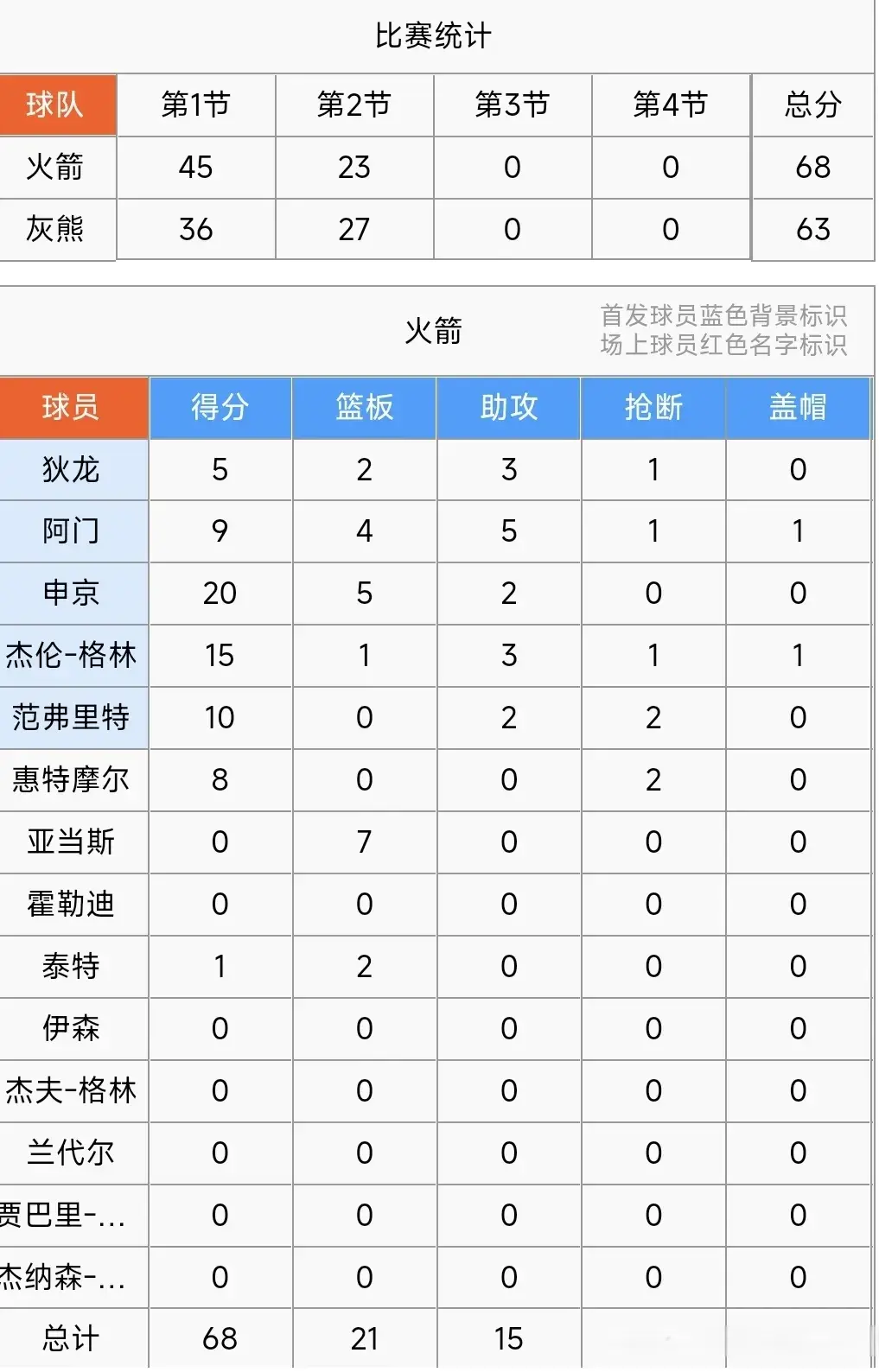第一节开打,韦尔斯制造杀伤罚球两罚全中得2分,狄龙回来暴扣得2分,贝恩技术罚球添1分,扎克.埃迪杀进篮下轻松放进2分,杰伦.格林滑翔劈扣得2分,开局灰熊队5:4领先!贾伦.杰克逊接着后仰跳投得2分,杰伦.格林杀进篮下轻松放进得2分,扎克.埃迪外线百步穿杨远射3分命中,申京后仰中投也进2分。双方陷入对攻模式你来我往杀的风生水起,首节结束火箭队45:36领先灰熊队9分,申京单节爆发砍下16分,杰伦格林13分。